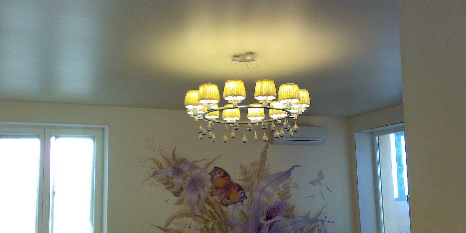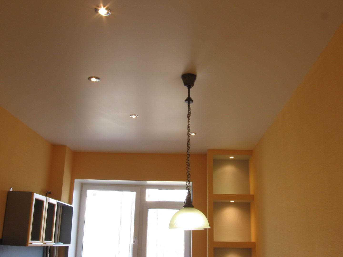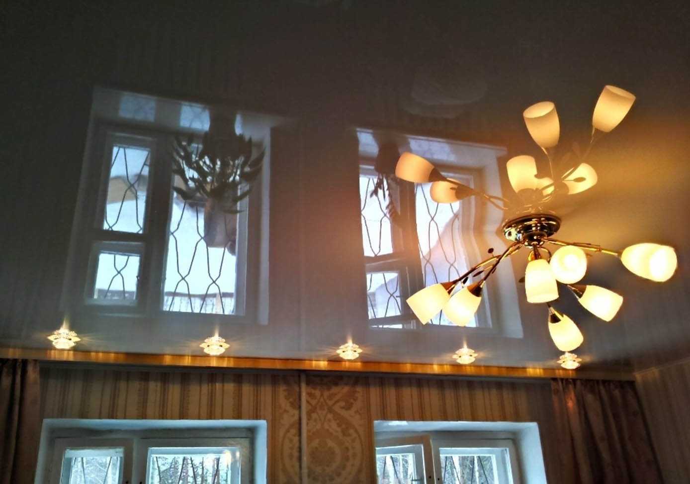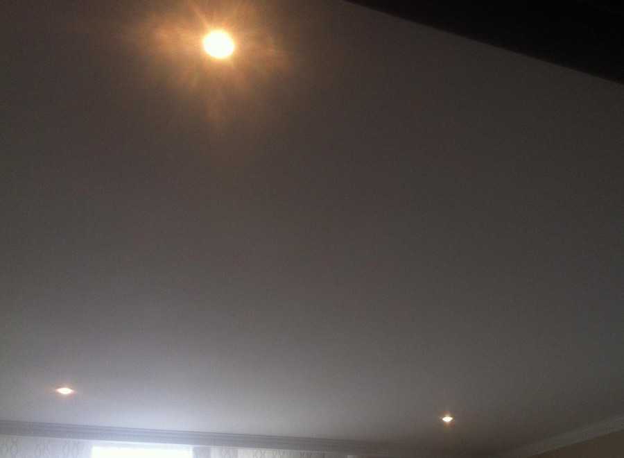 Если же осветительные приборы расположить ниже натяжной конструкции – освещение будет более рассеянным и равномерно распределён по всему периметру помещения.