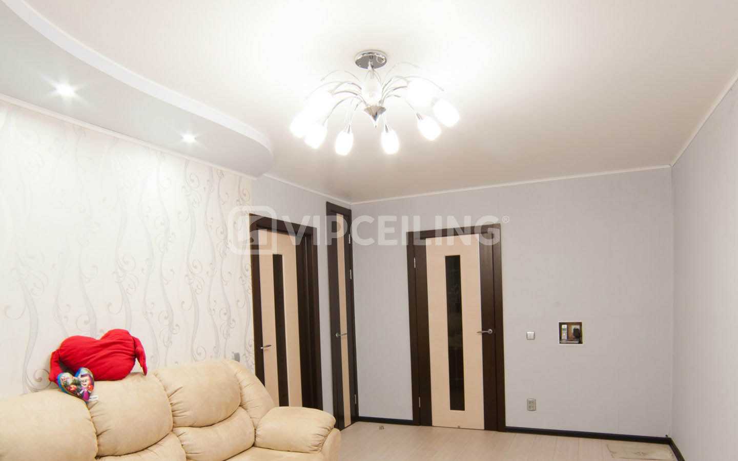 Матовая поверхность отличается низким уровнем взаимодействия с источниками света в комнате. В залах она нередко используется, чтобы сместить акценты на мебель или стены. Неспособность отражать свет полностью развязывает руки любителям массивных центральных люстр с большим количеством съемных элементов — ведь в случае использования такого источника света на глянцевом потолке вы рискуете спровоцировать создание «феерического» светового шоу, которое, вероятно, наскучит уже через несколько часов своей настойчивой активности.