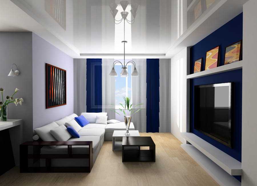 Примеры удачного использования глянцевых натяжных потолков в зале с люстрой и светильниками — на фото ниже.