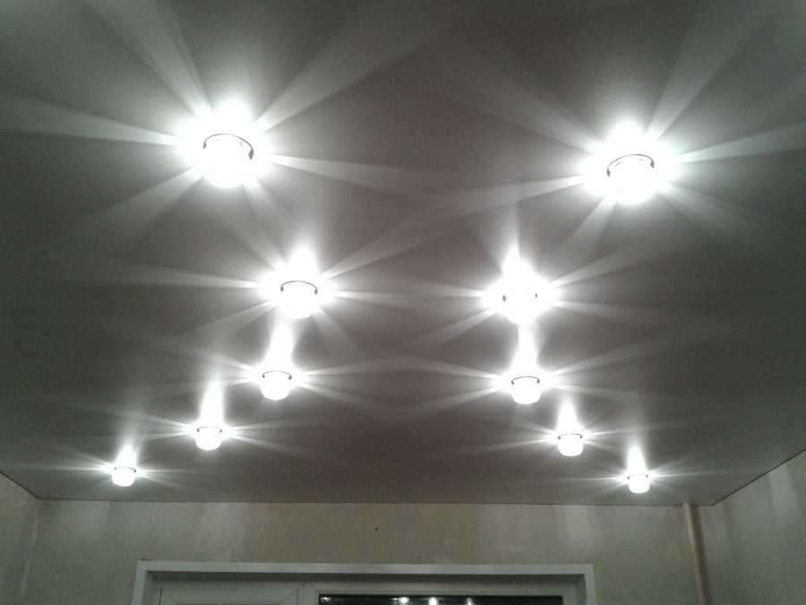 Точечный светильник распространен для натяжных потолков. Их располагают в любом порядке, по вашему усмотрению.
