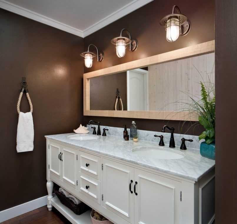 Подумайте, какой «благородный» металл будет сочетаться с цветом мебели, плитки, сантехники? Матовый или блестящий? Значение имеет и общий стиль помещения и выбранного светильника.