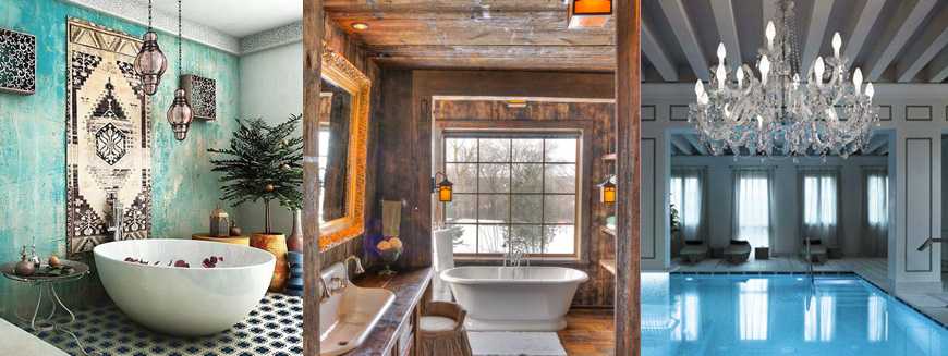 3 — для общего освещения пространства, создания особой атмосферы и реализации дизайнерского решения помещения (при учете, что площадь и высота потолка позволяют) можете смело вешать люстру в ванную комнату. Если она висит на безопасном от воды расстоянии, в помещении работает вентиляция, порадуйте себя желанным светильником в ванной.