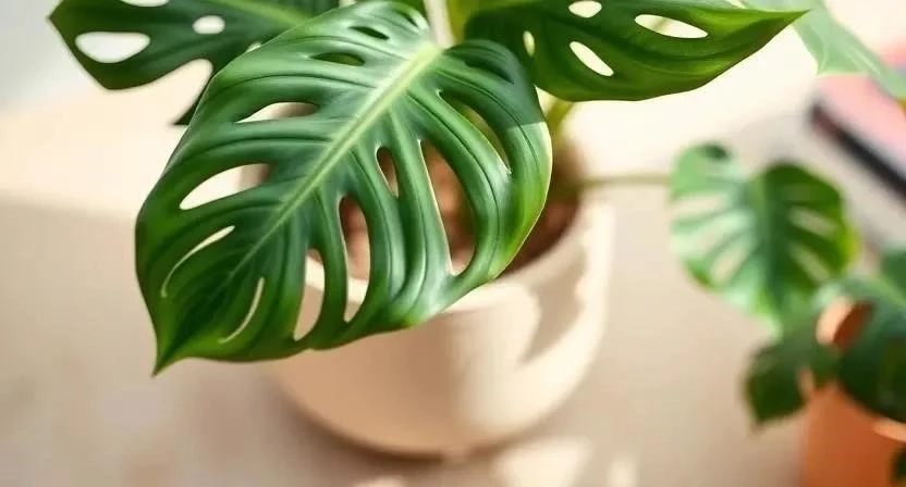 - Монстера. Крупные резные листья создают эффект тропиков. Требует много пространства и опору.