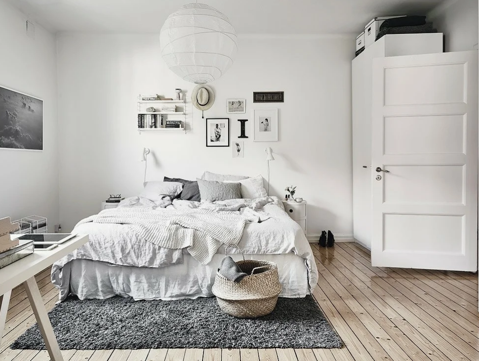 В спальне принципиально важна гармония и чтобы ничего не отвлекало от отдыха и релакса. Здесь нет места бесполезным мелочам, кричащим деталям и агрессивным акцентами, поэтому уютный скандинавский стиль удивительно уместен. Деревянная мебель, льняное белье, бежевые и пастельные оттенки, цветные декоративные подушки и прикроватный коврик с этническим орнаментом – все это уместно в спальне.