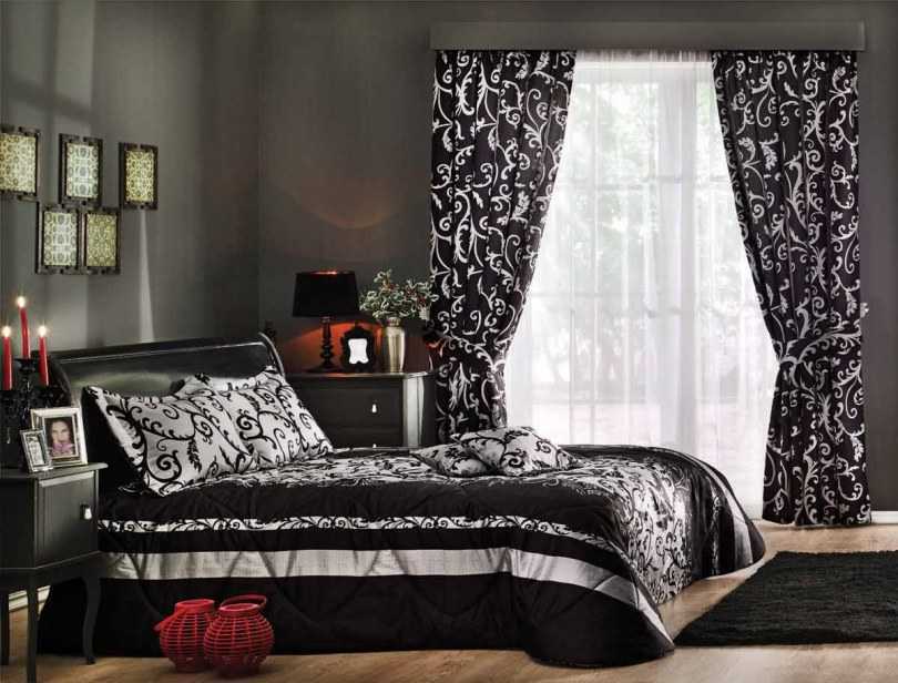 - Сочетание с цветом штор. Обычно покрывало со шторами подбирают в спальню, как сумочку с туфлями – в один цвет. Такое сочетание считается признаком хорошего вкуса и наличия стиля. Правда, сегодня данный подход признают устаревшим и слишком консервативным. Впрочем, отказываться от идеи данного единства полностью все же не стоит: с узором штор можно сочетать, например, подушки на кровати или же «юбку» покрывала, которая прикрывает ножки кровати. Также можно ударить ярким акцентом по диванным подушкам и подвязкам на гардинах.