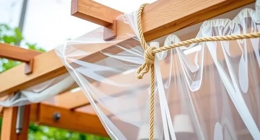 Шторы из пленки – это самый простой и быстрый способ защитить беседку от солнца и дождя. Для их изготовления не потребуется швейная машинка или сварочный аппарат. Достаточно просто вырезать пленку по размеру проемов и закрепить ее на каркасе беседки с помощью веревок или прищепок. Я использовал этот вариант, когда нужно было быстро защититься от внезапного дождя.