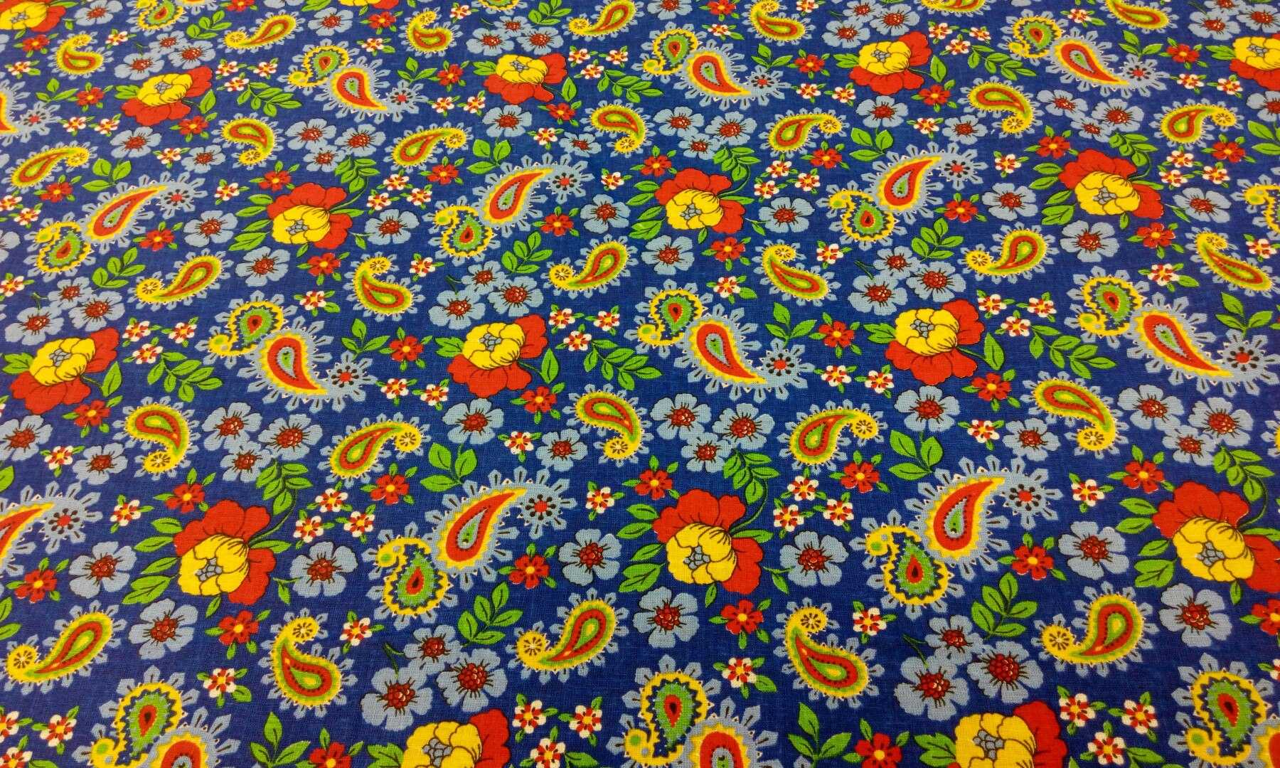 «Бабушкин» ситец. Имеет неопрятную, фабричную текстуру. Нанесение орнамента поверх готовой ткани.