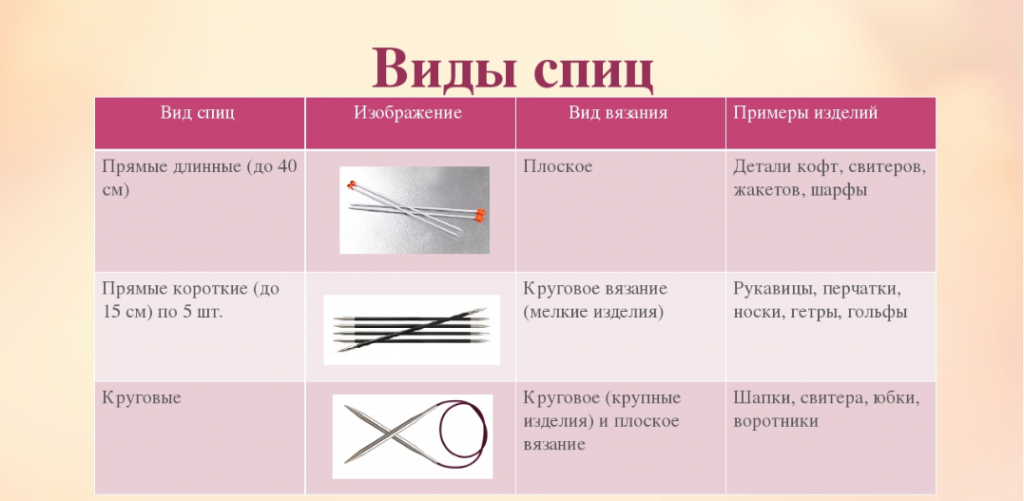 Для легкой пряжи используют спицы из пластмассы или костяные. Для тяжелой подойдут деревянные и металлические. Номер инструмента соответствуют её диаметру. Чтобы подобрать оптимальный диаметр, нужно толщину пряжи умножить на 2.