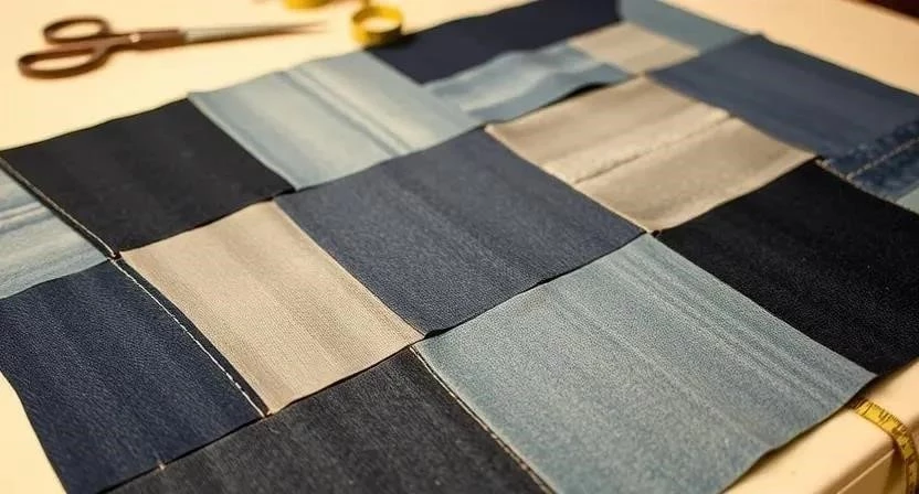 2. Сборка блоков: Сшейте лоскуты, комбинируя разные оттенки джинсовой ткани. Время: 3-4 часа.
