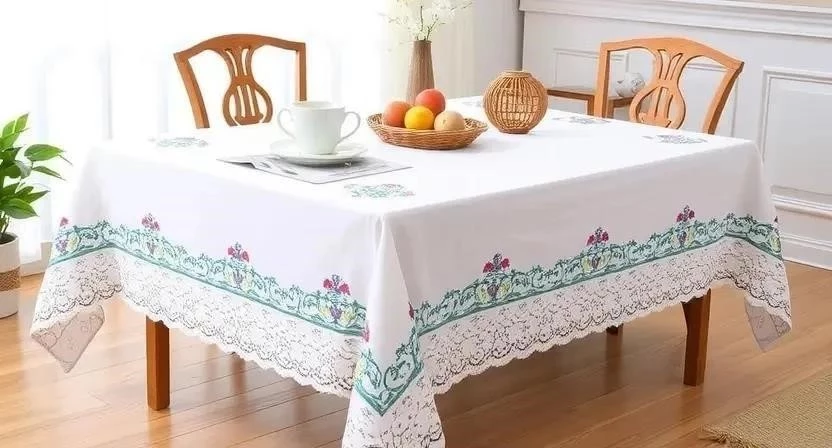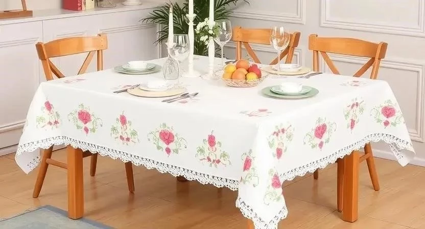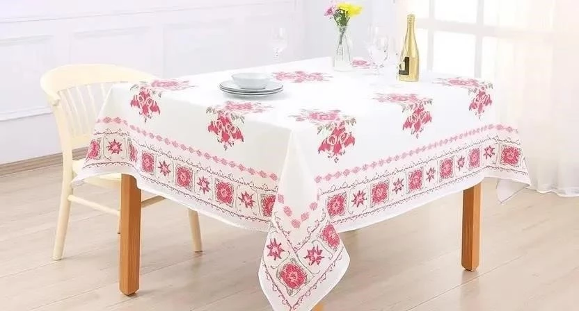 - Хлопок: Мягкий, приятный на ощупь, хорошо впитывает влагу. Хлопковые скатерти практичны, но могут давать усадку после стирки.