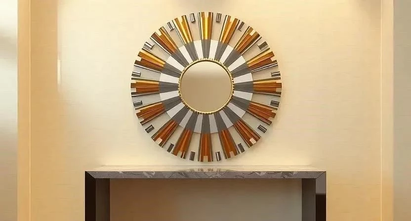 Отделка арт-деко на стенах предполагает многослойность. Мы часто используем сочетание декоративной штукатурки с зеркальными вставками. Обои с геометрическим рисунком (ромбы, чешуя, зигзаги) отлично работают в качестве акцентных зон. В своей практике я часто использую зеркальное панно из состаренных полотен, чтобы визуально расширить пространство и добавить интерьеру загадочности.