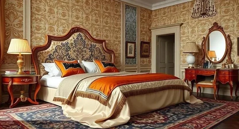 - Спальня: Кровать с балдахином, шелковые шторы, прикроватные тумбочки с антикварными лампами, зеркало в резной раме, ковер с восточным орнаментом.