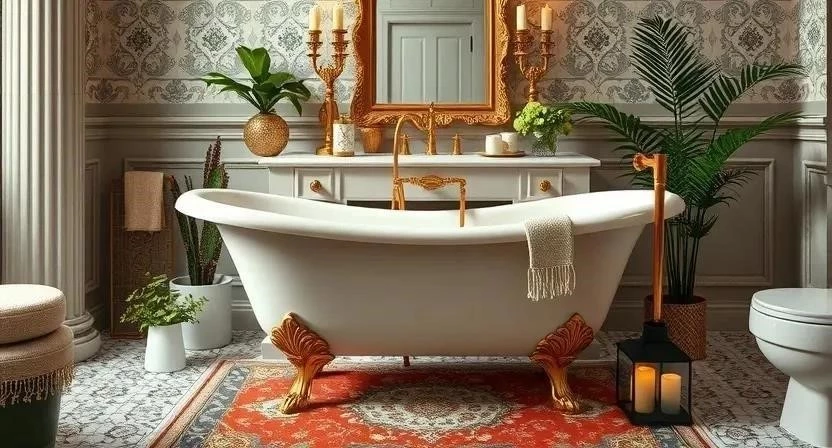 - Ванная комната: Ванна на ножках, зеркало в резной раме, мозаичный пол, бра с хрустальными подвесками, полотенца с ярким узором.