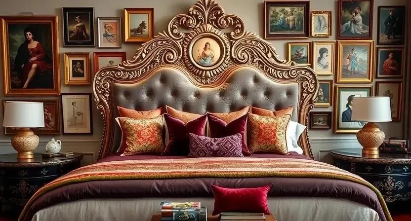 Пример 2: Спальня в стиле винтажного максимализма. Антикварная мебель, шелковые шторы, картины в рамах, старинные книги. Создает атмосферу романтики и уюта. Совет: Добавьте зеркало в резной раме и прикроватную тумбочку с лампой.