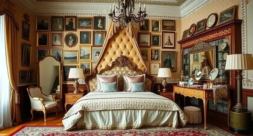 - Спальня: Кровать с балдахином, шелковые шторы, туалетный столик с зеркалом в стиле рококо, много декоративных подушек.