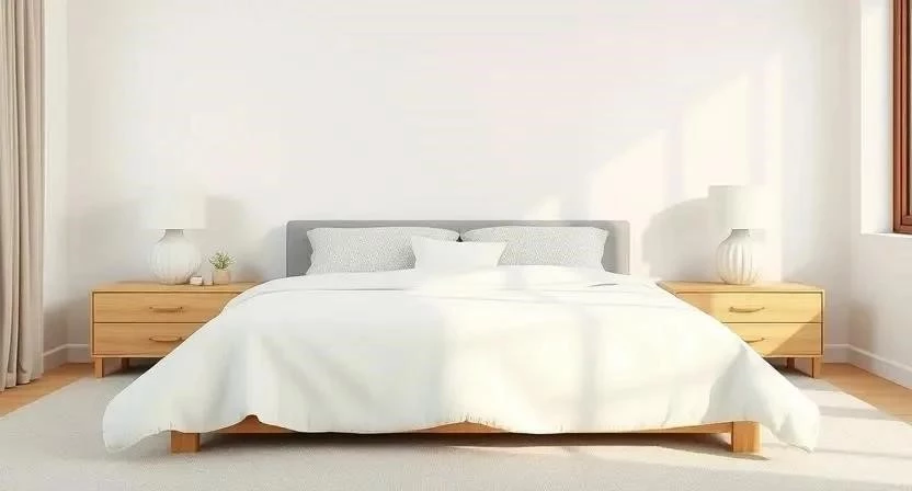 2. Спальня в бежевых оттенках: Бежевые стены, деревянная кровать, белое постельное белье, прикроватные тумбочки из дерева, настольные лампы.