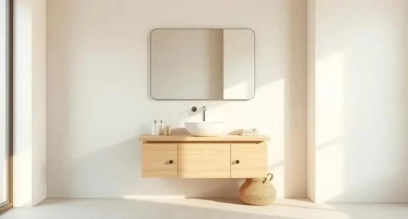 4. Ванная комната в светлых тонах: Белая плитка, деревянная столешница, зеркало с подсветкой, минимальное количество аксессуаров.