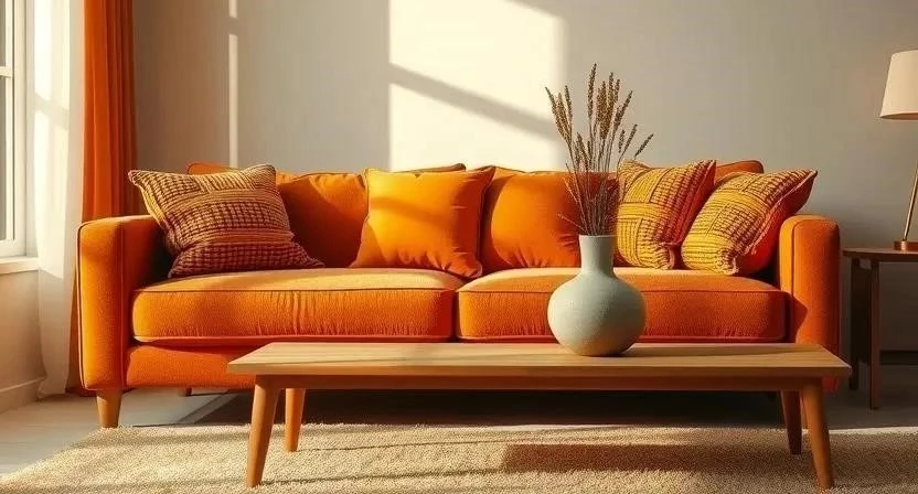 | Гостиная | Терракотовый, коричневый | Кожаный диван | Оранжевые подушки, ковер |