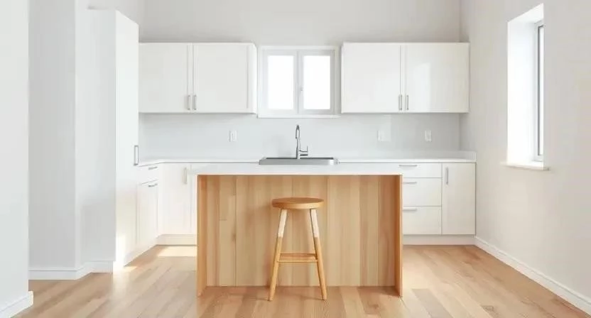 - Кухня в белых и деревянных тонах: Белые фасады, деревянная столешница, минималистичная посуда, растения в горшках. Акцент – деревянные полки с книгами и декоративными предметами.