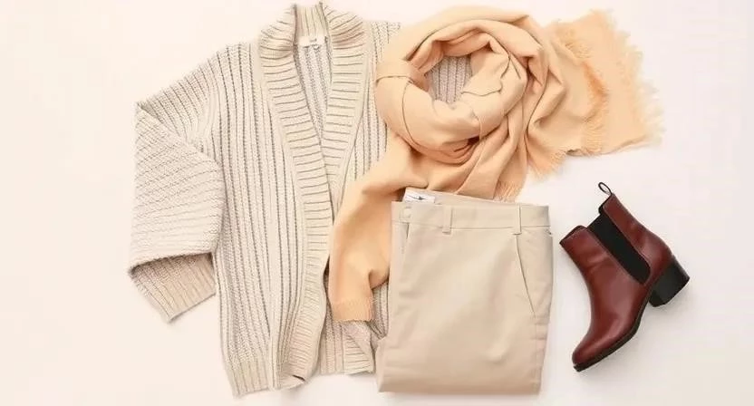 | Осень | Бежевое пальто с теплым свитером и кожаными ботинками. | Шерсть, кашемир, кожа |