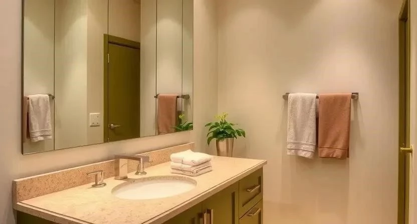 Ванная: В ванной оливковый и бежевый можно использовать для создания расслабляющей и умиротворяющей атмосферы. Стены можно отделать бежевой плиткой, а пол – оливковой. Добавьте несколько растений, чтобы оживить интерьер.