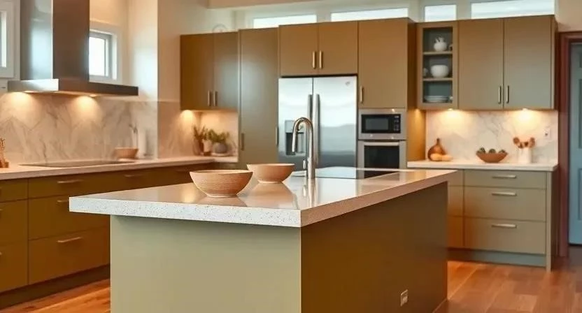 Кухня: На кухне оливковый и бежевый можно использовать для создания теплой и гостеприимной атмосферы. Кухонные фасады можно покрасить в оливковый цвет, а столешницу и фартук отделать бежевой плиткой. Добавьте несколько растений, чтобы оживить интерьер.