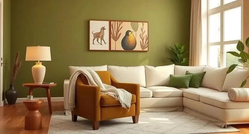 - Гостиная: Используйте оливковый цвет для стен, мебели или декора.