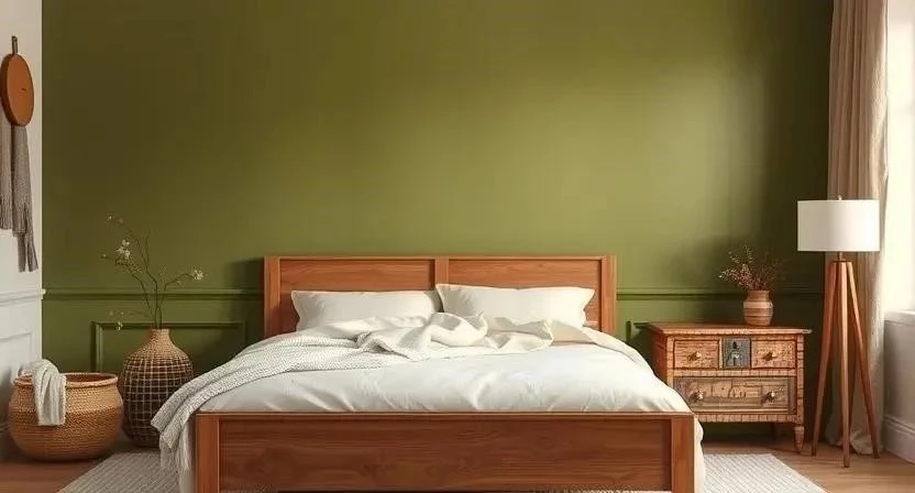 - Скандинавская спальня: Оливковые обои, белая кровать, деревянный прикроватный столик, теплый плед и приглушенное освещение.