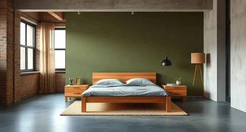 3. Спальня с оливковыми стенами и деревянной мебелью.
