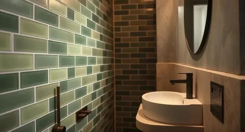 4. Ванная комната с оливковой плиткой и белой сантехникой.