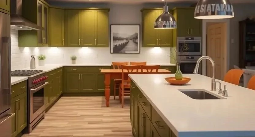 Кухня: В кухне оливковый цвет можно использовать для покраски стен, фасадов мебели или кухонного фартука. Сочетайте его с белым цветом, деревянной столешницей и металлическими элементами. Я выбрал оливковые фасады для кухни, и это было отличное решение – кухня выглядит очень стильно и современно.
