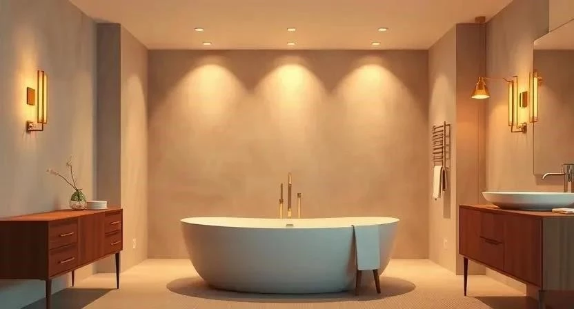 - Ванная: Нейтральный свет, зеркало с подсветкой, точечные светильники.