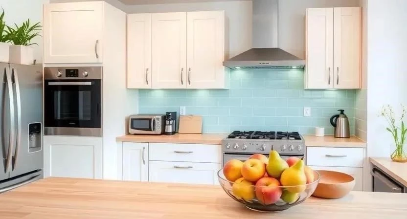 - Кухня: кремовые фасады, голубая плитка, бежевый стол и стулья.