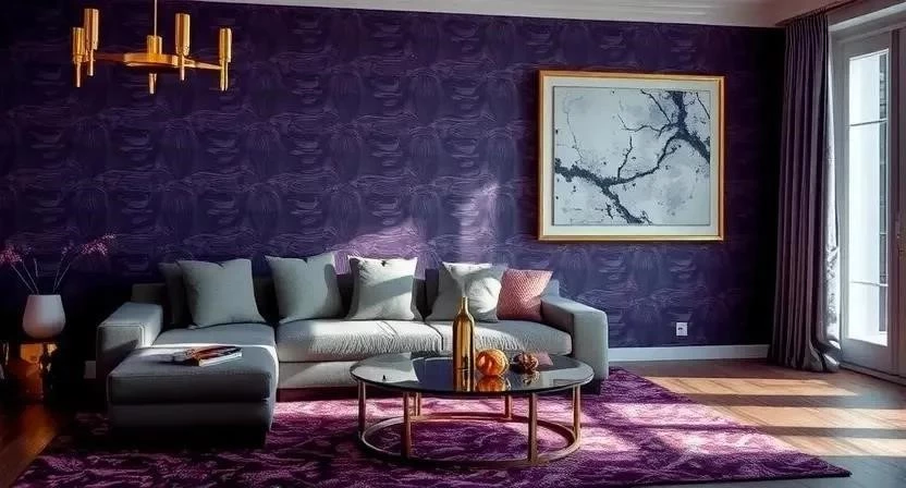 В гостиной фиолетовые обои подчеркнут элегантность и роскошь интерьера. Можно использовать более насыщенные оттенки, такие как баклажановый или аметистовый, и сочетать их с золотыми или серебряными акцентами. Фактура обоев может быть рельефной или глянцевой, чтобы добавить визуальный интерес. Важно правильно зонировать пространство, используя разные оттенки фиолетового.