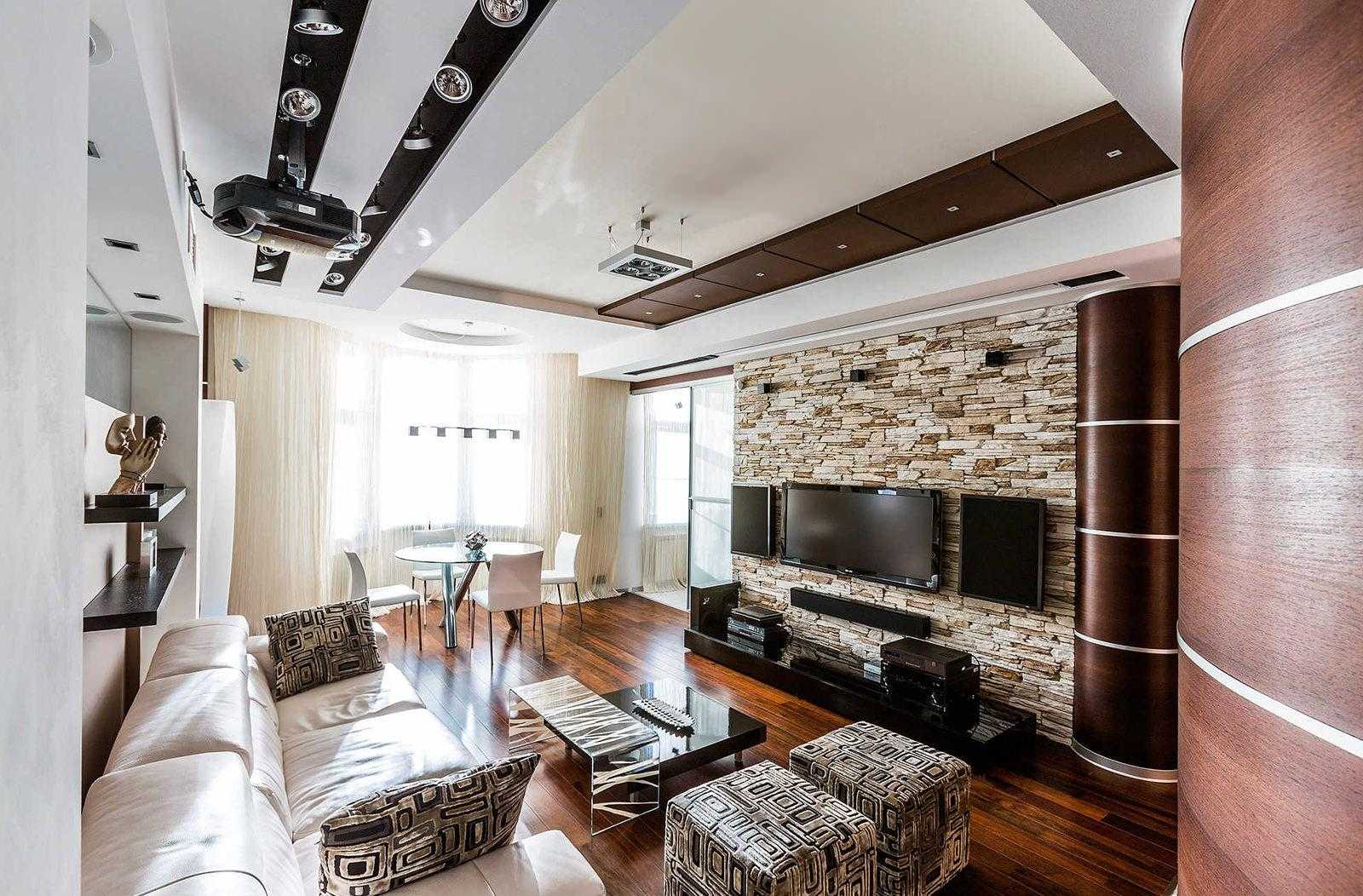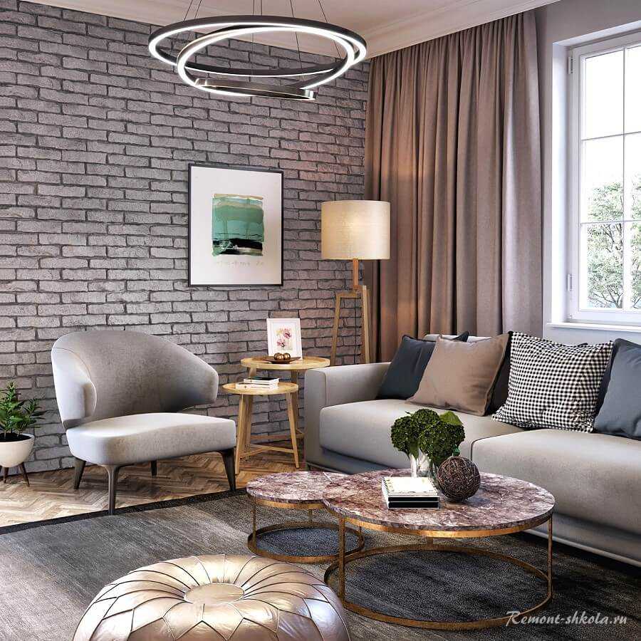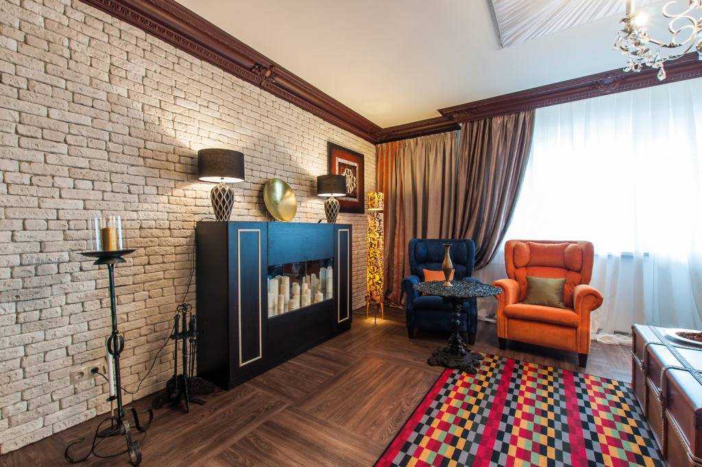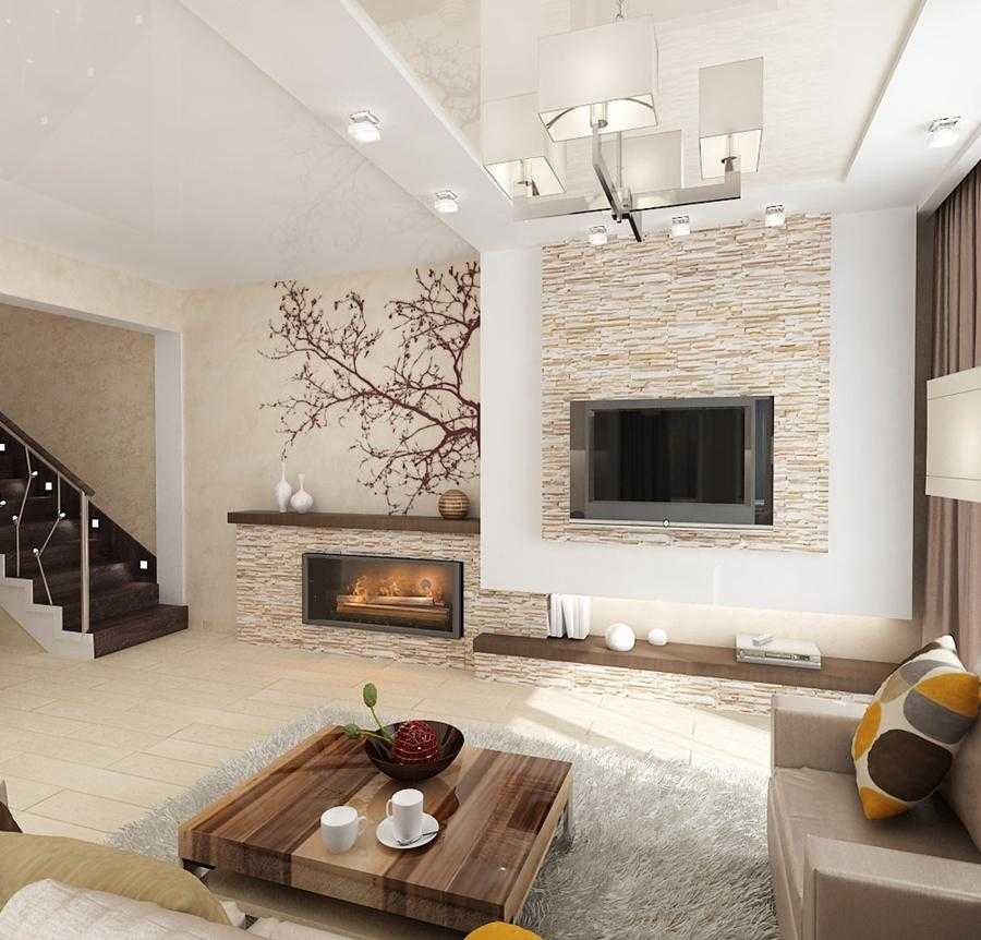 В общей зале применяют такой прием оформления, как отделывание плиткой одной стены. Тогда как другие стены оставляют оклеенными обоями либо окрашенными. Отдельные элементы декора в гостиной тоже очень хорошо воспринимаются визуально, если они отделаны гипсовым декором. Однако, отделывая камин в зале посредством гипса, следует учитывать температурные противопоказания материала. Неординарно выглядят колонны, облицованные под кирпич или под натуральный камень