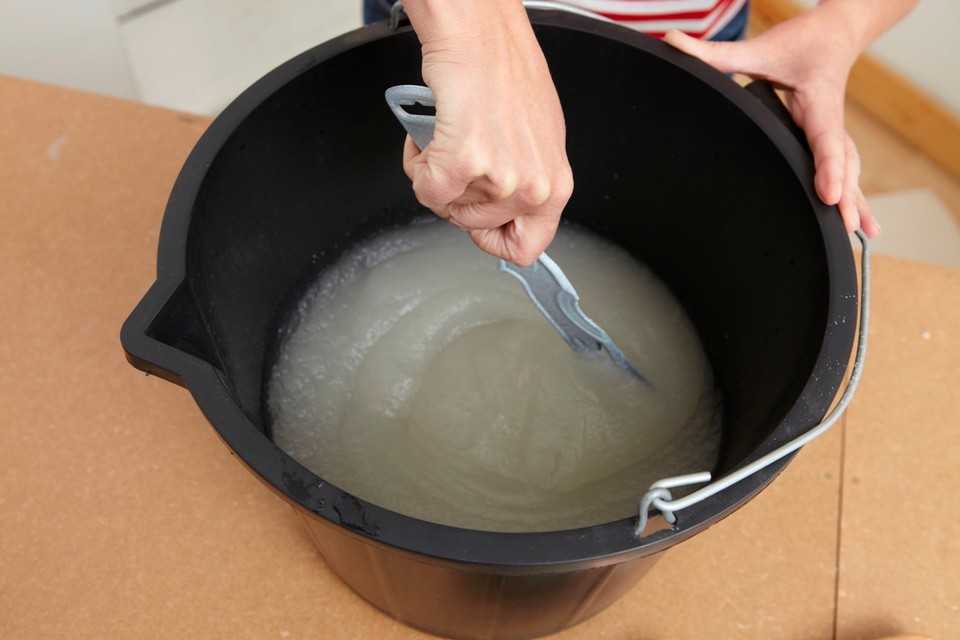 Вернемся к клею, который нужно разводить с водой. Именно такой пользуется наибольшим спросом. Разводится такой клей в предварительно подготовленной емкости с водой, постепенно добавляя небольшую порцию сыпучей смеси. Пропорции будут указаны на упаковке производителем, старайтесь соблюдать все указания. Заранее рассчитайте расход клея в зависимости от площади стен помещения, при этом не забудьте округлить цифру про запас в большую сторону.