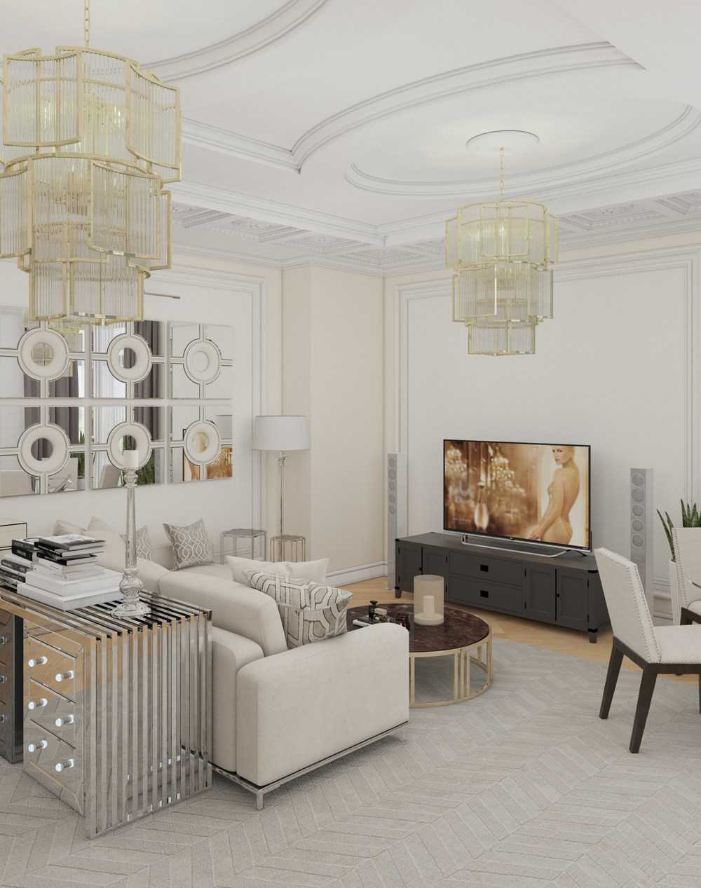 Подобная тенденция объясняется популярностью театральной эстетики со сложными декорациями, тяжелыми портьерами и блестящими деталями. Так что чем больше зеркал, блеска, фактурного текстиля, тем лучше. Главное – не переборщить, особенно при оформлении небольшой квартиры.