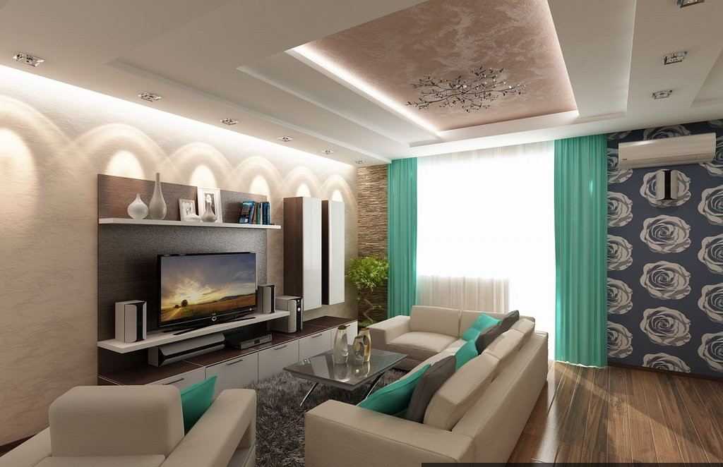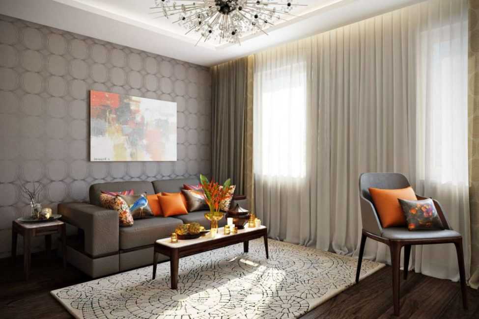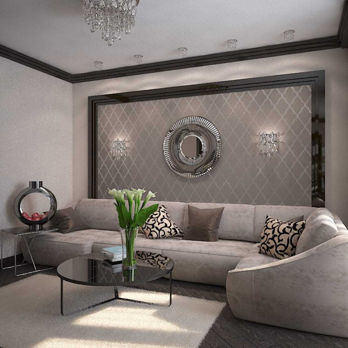 Размер гостинойЭто показатель, который учитывают первым. Этому есть объяснение: строгие ограничения для просторного помещения не существуют, а вот для комнаты небольшого размера не подходят отделочные материалы в темных тонах. Выбирайте для отделки интерьера светлые и воздушные варианты, так помещение визуально будет выглядеть просторней. Лучше подобрать полотно для стен в гостиную молочного цвета, с оттенками розового или золотистого. Рисунок с изображением крупных форм подходит для большой комнаты, а с мелким орнаментом – для маленькой.