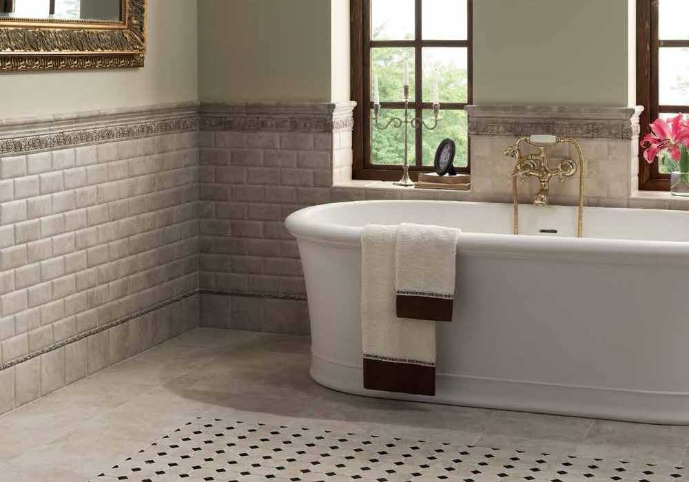 Очень популярен другой вариант классической отделки с бордюром. Здесь нижняя треть стены облицовывается более насыщенным по цвету кафелем, а верхняя в пастельных тонах. Рекомендуется все элементы отделки подбирать из одной коллекции, одного производителя, чтобы обеспечить четкое соответствие оттенков и орнамента. Дополняется ансамбль бордюром и плинтусом, выполненным из тех же видов плитки со специально подобранным узором и цветовой гаммой.