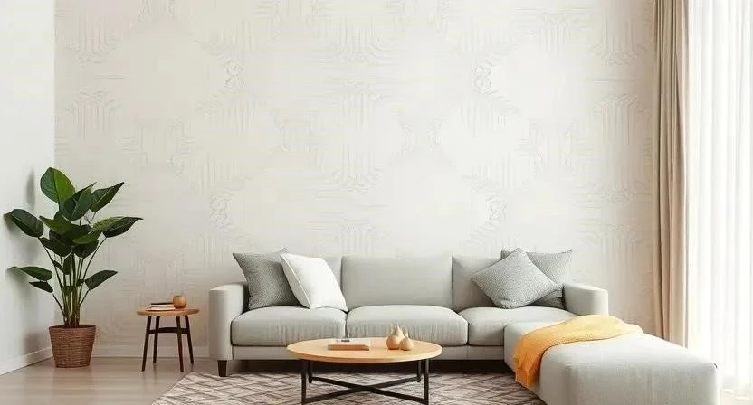 - Гостиная: Акцентная стена за диваном, оформленная обоями с крупной мозаикой.