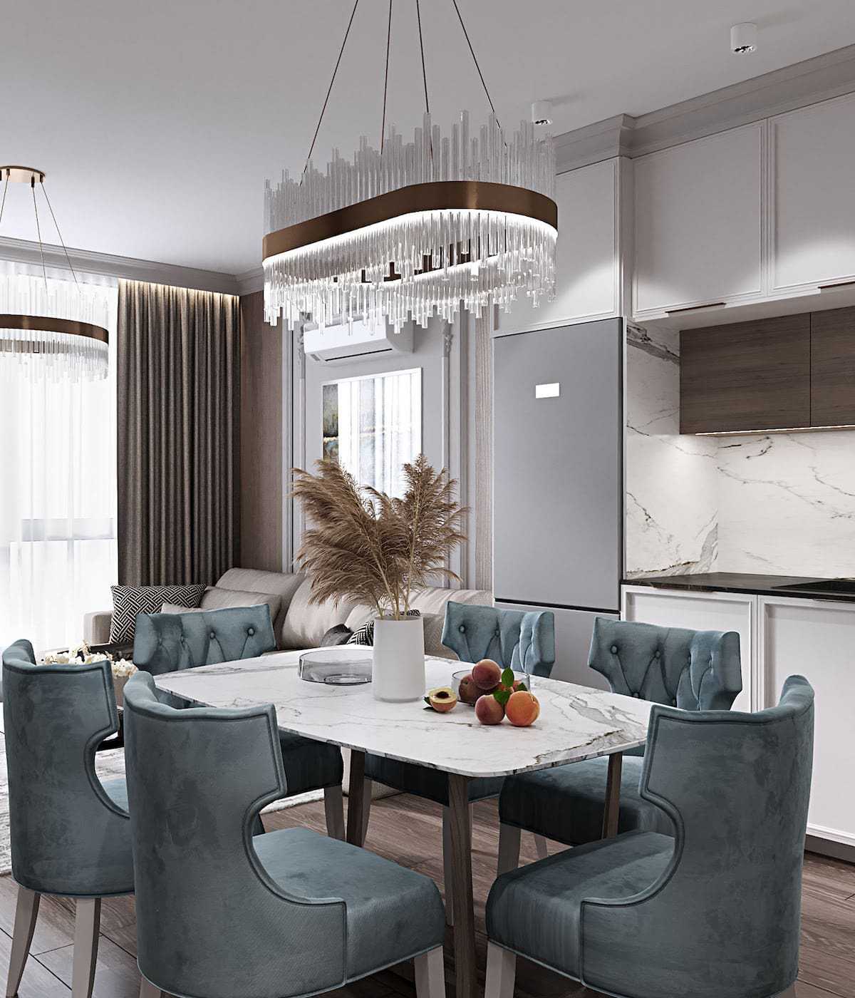 Динамика. Особенностью динамичных современных интерьеров служит урбанистическая тематика, предполагающая применение инновационных материалов, четкой геометрии в линиях, а также дополнительные детали с чертами индустриального стиля: металлические сетки на мебельных фасадах, массивные потолочные светильники. В цветовом решении часто присутствует контрастные оттенки.