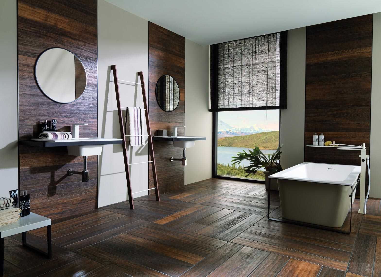 Для создания современной стилизации в ванной комнате лучше выбрать натуральный камень или его имитацию, например керамогранит. Тренд последнего времени – крупного размера плитка, имеющая фактуру природного камня либо древесины. Представленные на фото интерьеры характеризуют дизайн современной ванной комнаты с темной плиткой.