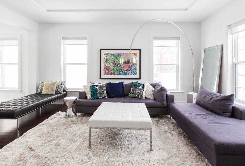 С белым. Сочетание с белым получается достаточно элегантным и контрастным. Он подчеркивает роскошь любых оттенков фиолетового, давая ему раскрыться. Простой прямой фиолетовый диван в союзе с белоснежным ковром поможет создать изысканную и стильную обстановку.