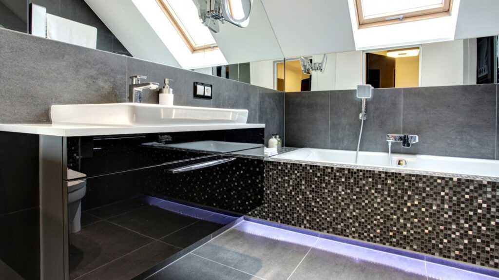 Темный стиль стен и пола, дополненный блестящей золотой или серебряной фурнитурой, позволяет создать гламурный дизайн, что придает статуса ванной. Однако с практической точки зрения он требует более частой уборки, чем белый пол.