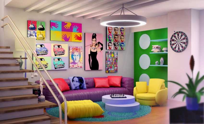 - Для современных динамичных стилей типа хай-тек, поп-арт и фьюжн подходят насыщенные и яркие оттенки.
