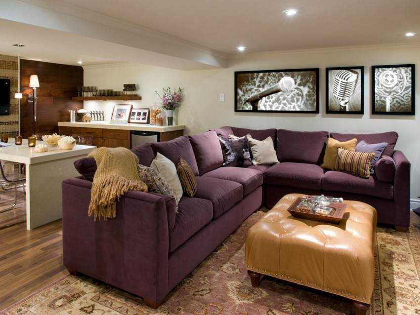 Делая акцент на фиолетовый, продумайте наиболее удачные комбинации с другими цветами. Фото фиолетового дивана в сочетании с декоративными элементами различных оттенков дадут представление о том, какой эффект вы получите в интерьере гостиной. Чем насыщенней оттенок (черничный, баклажанный, аметист), тем более нежные тона должны его дополнять.