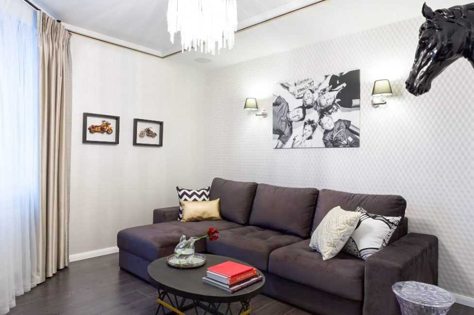 - В современном стиле — фотографии в черных рамках, серая обивка мебели, широкоформатные постеры, светильник с геометрическими формами.