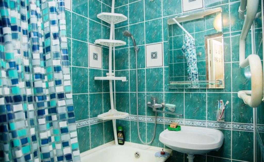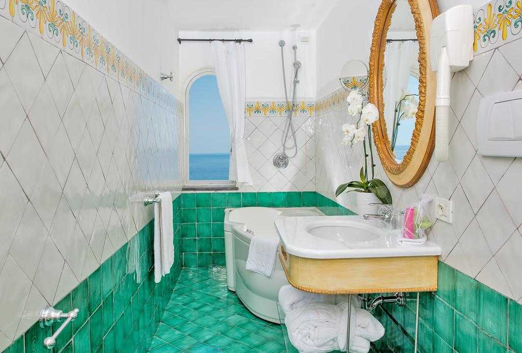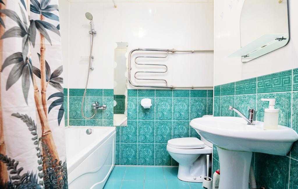 В этом помещении часто комбинируют синеватые оттенки с зелеными: они напомнят о море, создадут приятную, гармоничную атмосферу. Чтобы не возникало ощущения сырости, краски надо подбирать правильно и разбавлять их белым, серым, кремовым цветами. Можно ввести в дизайн тематические узоры в плитке, аксессуарах: например, зеркало, как иллюминатор корабля, декор в виде волн.