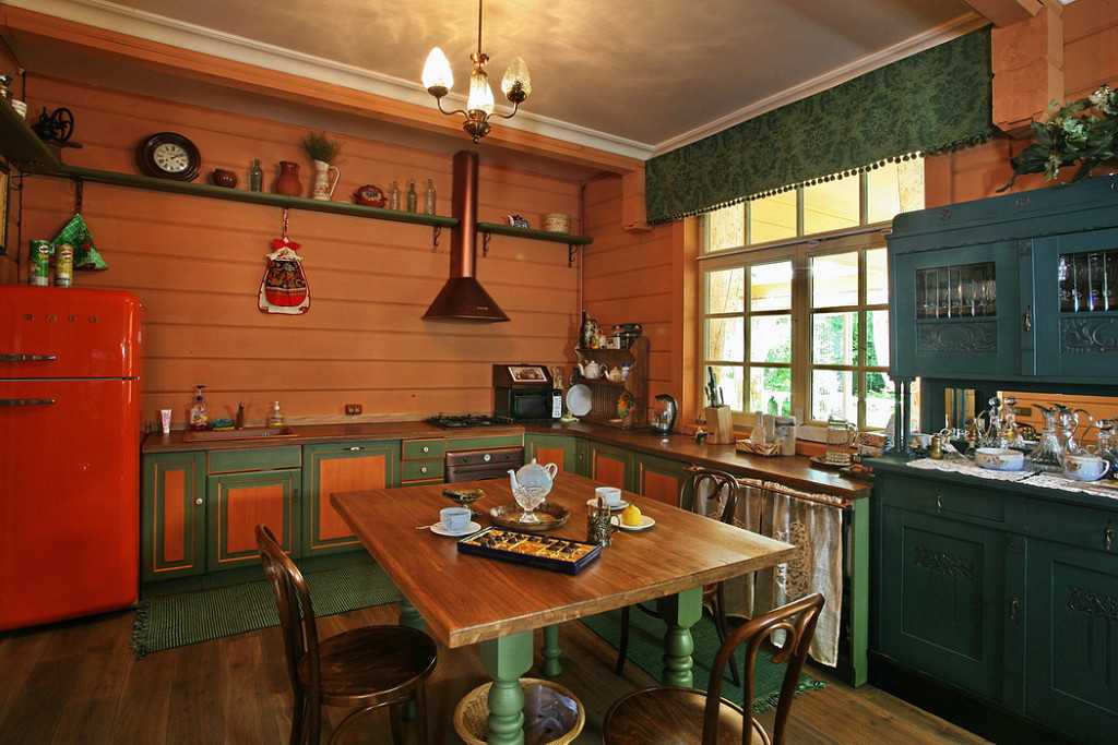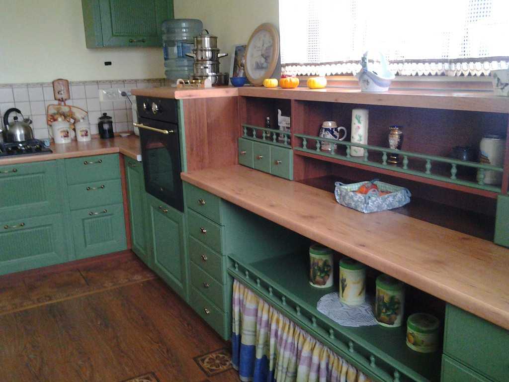 Для реализации идеи можно установить в помещении деревянный гарнитур в деревенском стиле, покрашенный в бледно-зеленый либо насыщенный зеленый цвет. На его полки следует расставить красивую керамическую посуду, бытовую технику рекомендуется спрятать за фасадами.