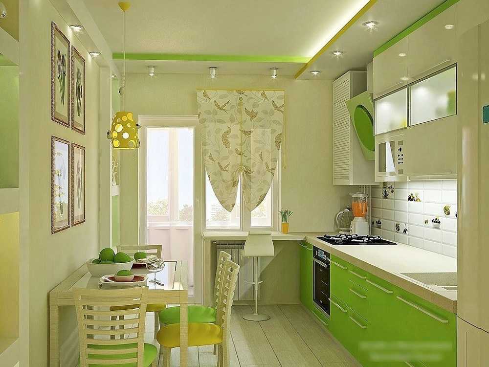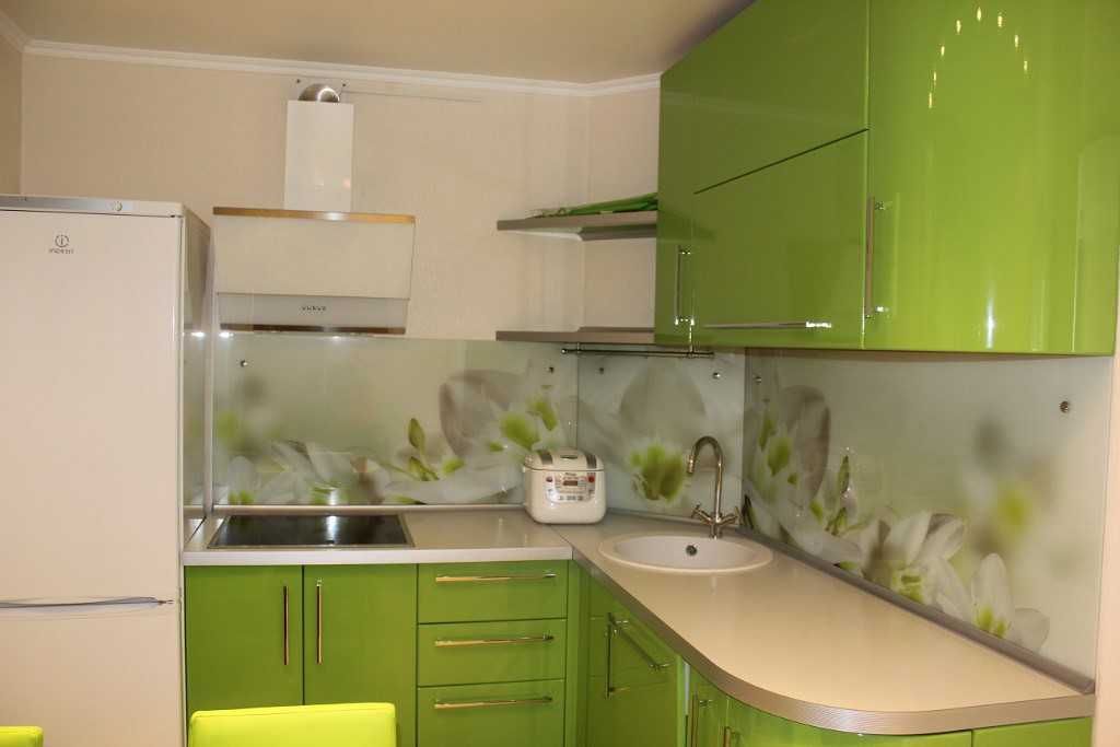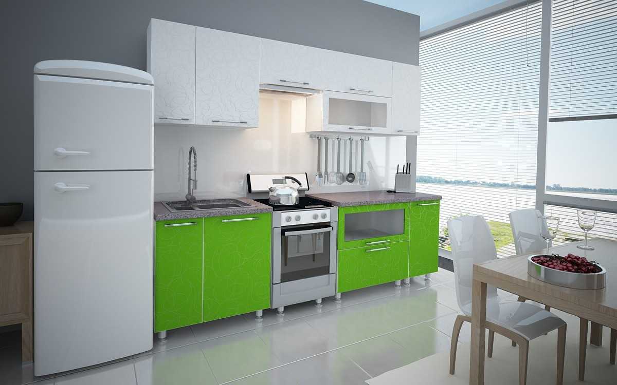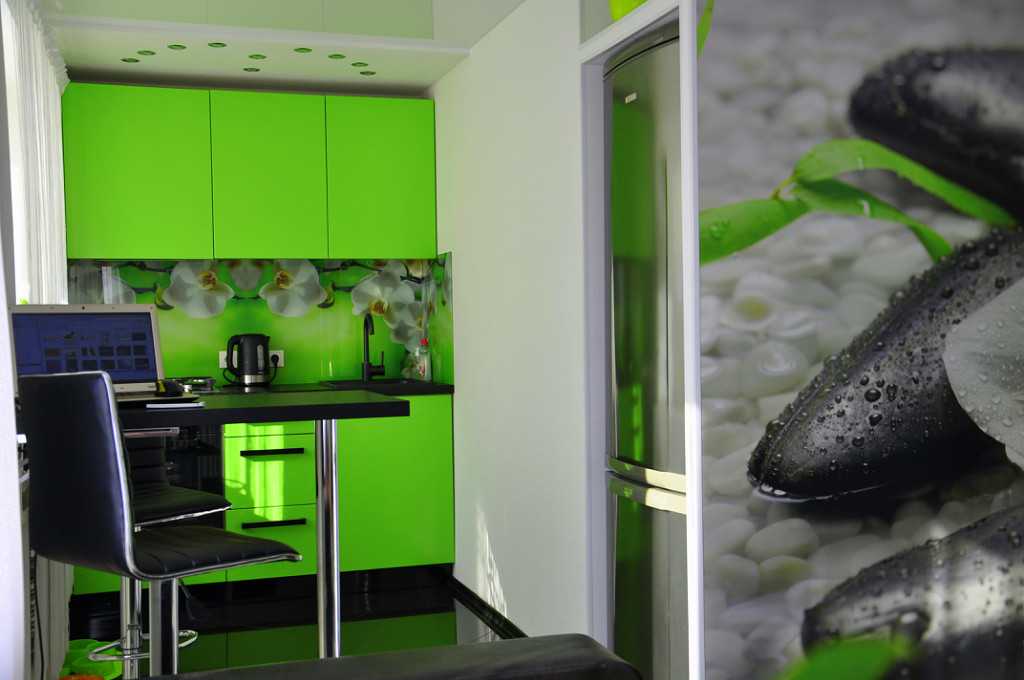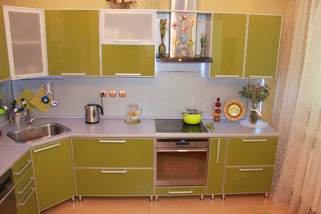 Чтобы обустроить такой интерьер, достаточно установить на кухне современный гарнитур из пластика с фасадами зеленого цвета.